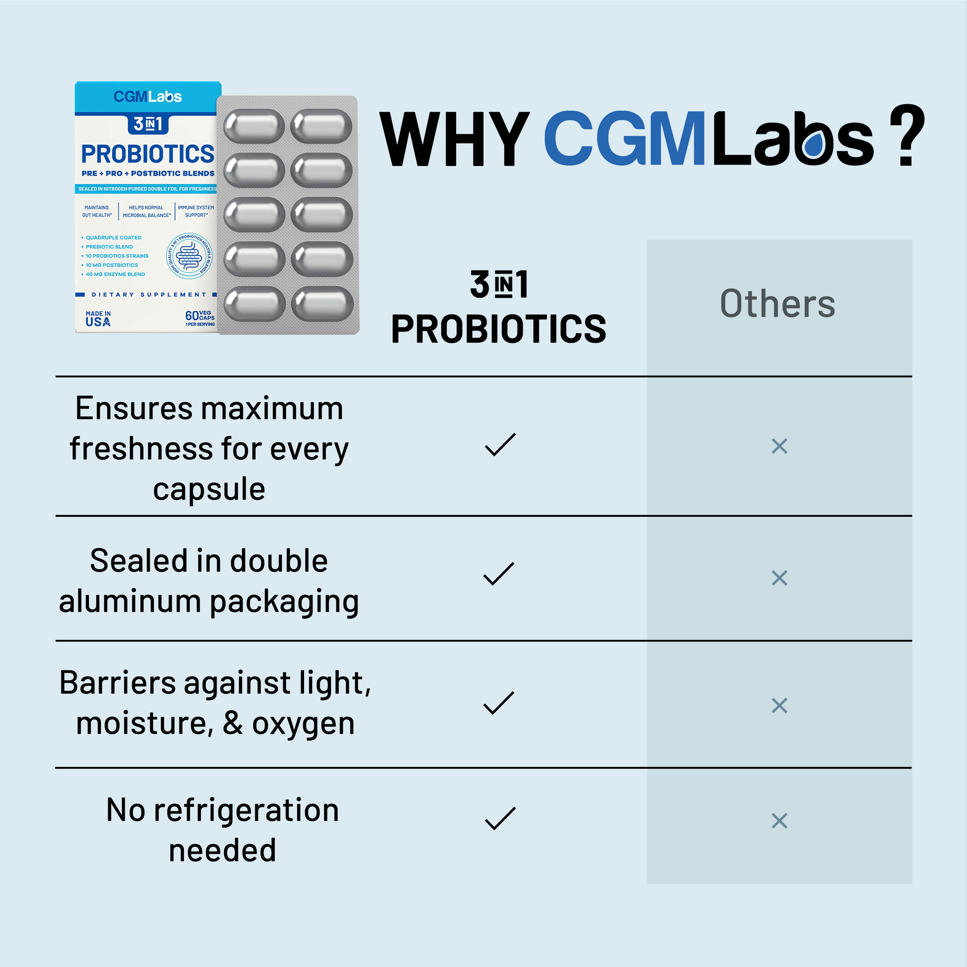 - TRUSTED QUALITY: CGM Labs is committed to producing high-quality supplements, and our 3 in 1 Probiotics are no exception. We use only the best ingredients and employ rigorous quality control measures to ensure that our products meet the highest standards.