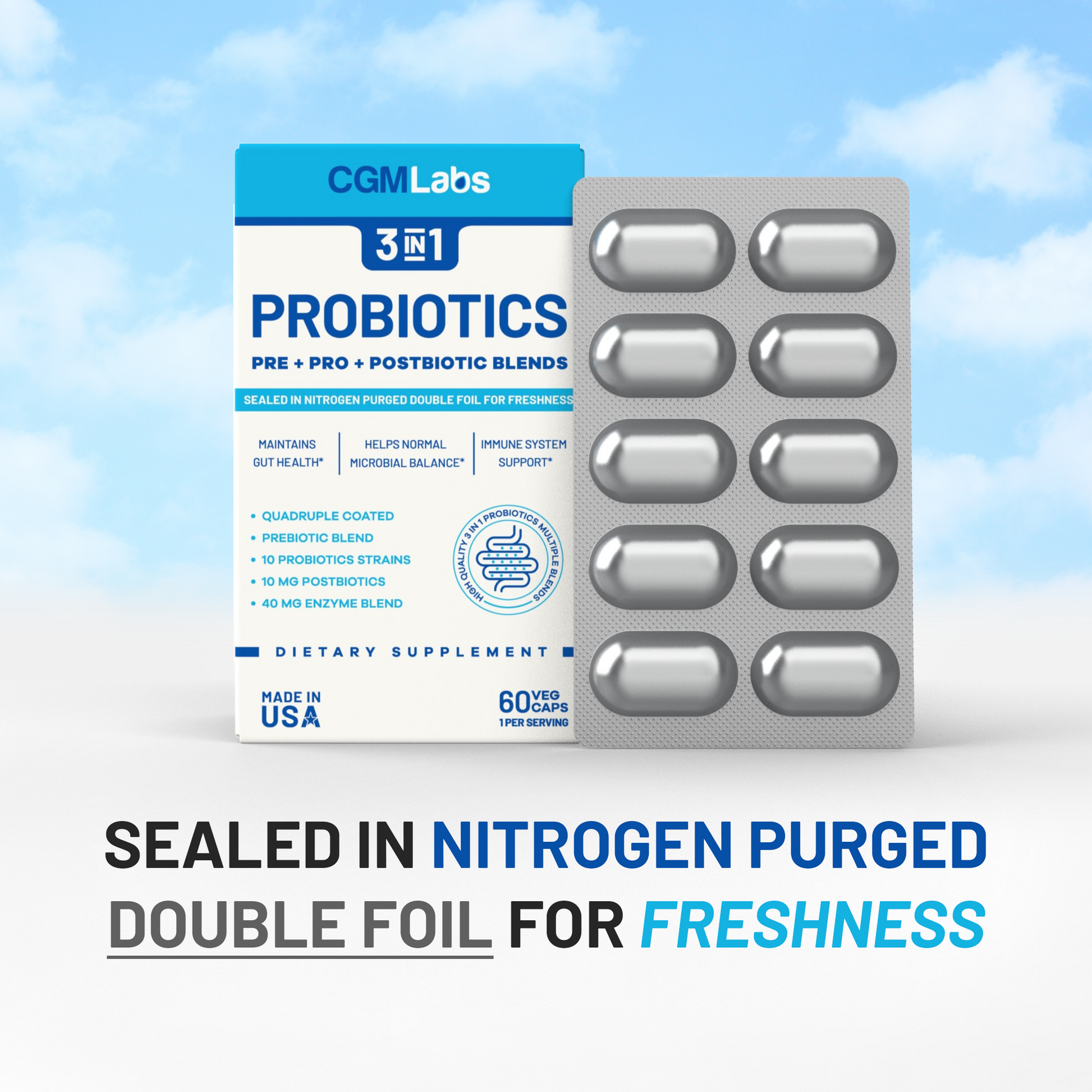 3 in 1 Probiotics - Prebiotics + Probiotics + Postbiotics All in one! Nitrogen Purged, Individually Packed in Double-foil Blister for Freshness by CGM Labs